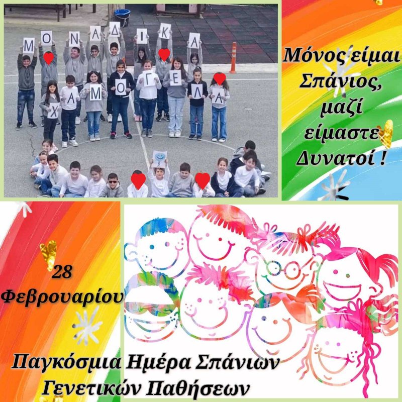 28 Φεβρουαρίου: Ημέρα Σπάνιων Νοσημάτων, μια μέρα μοναδική και ξεχωριστή! Τα παιδιά του σχολείου μας τίμησαν τη μέρα αυτή, φορώντας τα "genes" (τζινς) τους και την άσπρη μπλουζίτσα τους, χαρίζοντάς μας τα δικά τους μοναδικά χαμόγελα! Είμαστε δίπλα τους, τους στηρίζουμε και τους χαμογελάμε απο καρδιάς!
