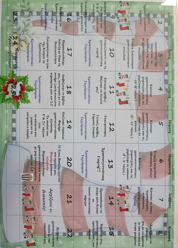 Δόθηκε στα παιδιά το χριστουγεννιάτικο μας σχολικό ημερολόγιο για τις δράσεις Δεκεμβρίου. Μπορείτε να δείτε το ημερολόγιο, αλλά και την επίσκεψη του λατρεμένου μας Άγιου Βασίλη πάνω σε γαϊδουράκι!