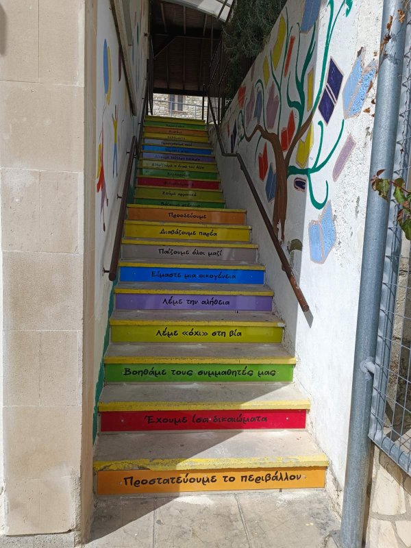 Κεντρικός γνώμονας του σχολείου μας είναι τα παιδιά! Τα χαρούμενα παιδιά και τα παιδιά με σεβασμό, ενσυναίσθηση και αγάπη! Το κεντρικό μαθητικό συμβούλιο, μαζί με τα υπόλοιπα παιδιά του σχολείου και το εκπαιδευτικό προσωπικό, έφτιαξαν, σκέφτηκαν, δημιούργησαν κι έβαλαν τη δική τους ξεχωριστή πινελιά για να διακοσμήσουν τα σκαλοπάτια του σχολείου. Με φράσεις, με προτάσεις που χαρακτηρίζουν κάθε παιδί του σχολείου μας. Η επιθυμία τους, έγινε πραγματικότητα! Θαυμάστε κι εσείς μαζί μας, τα όμορφα σκαλοπάτια του σχολείου μας, με χρώματα εμποτισμένα με πολλή αγάπη από τα παιδιά μας, σύμφωνα με τις αξίες τους!